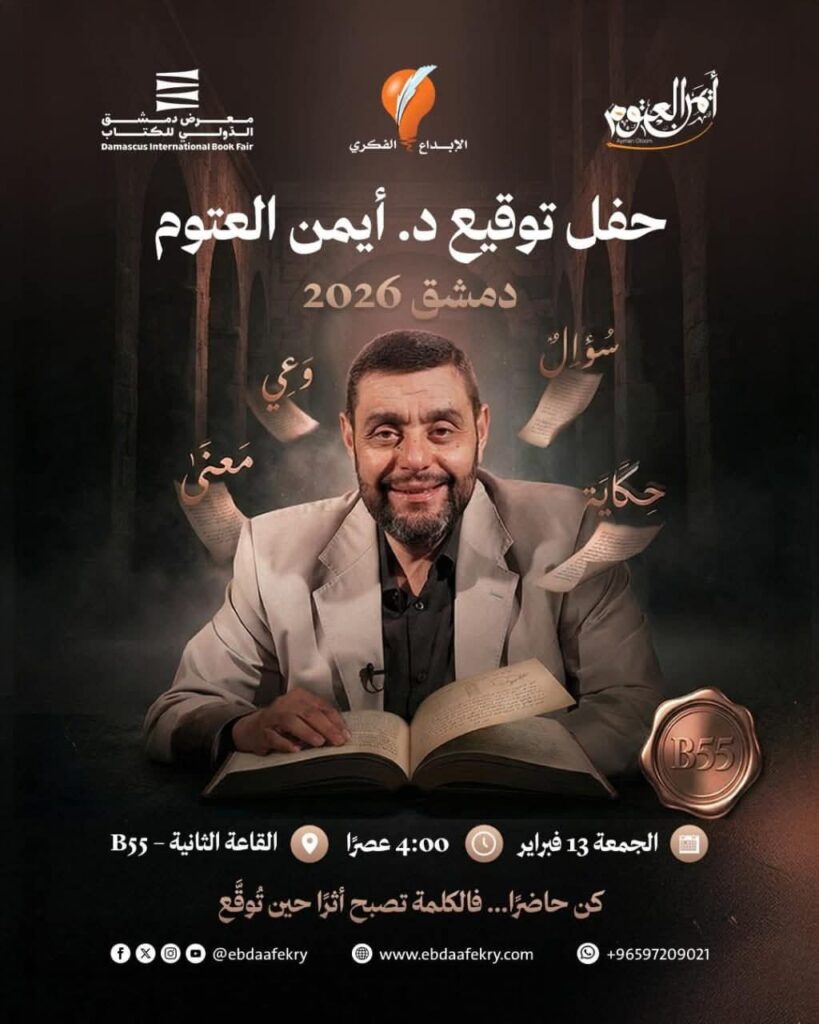 الأحبة في سوريا الحبيبة هذه مواعيد مشاركتي في معرض دمشق الدولي للكتاب:1. الثّلاثاء 10-2-2026م محاضرة السّاعة (2) ظهرًا في المكتبة الوطنيّة، بعنوان: (تجربتي في القراءة).2. الأربعاء 11-2-2026م توقيع أعمالي كافّة في جناح دار الرّموز العربيّة، في القاعة الأولى A3 من السّاعة الرّابعة إلى التّاسعة مساء.3. الخميس 12-2-2026م محاضرة في معرض دمشق الدّولي للكتاب السّاعة الرّابعة والنصف داخل المعرض، بعنوان: (أسئلة القراءة)، يليها توقيع أعمالي في جناح دار الرّموز العربيّة، القاعة الأولى جناح A3.4. الجمعة 13-2-2026م توقيع أعمالي كافّة في جناح دار الإبداع الفكريّ في القاعة الثانية B55 من السّاعة الرّابعة إلى السّاعة التّاسعة.5. السّبت 14-2-2026م توقيع أعمالي كافّة في جناح دار الغوثاني، في القاعة الأولى A38 من السّاعة الخامسة إلى التاسعة مساءً، إن شاء الله.ألقاكم بالشوق والحبّ.أهلاً وسهلاً بكم جميعًا.